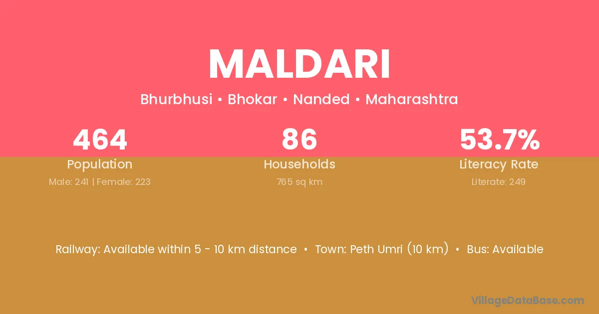 Peth Umri (10 km) is the nearest town to Maldari village for major economic activities and is located approximately 10 km away.