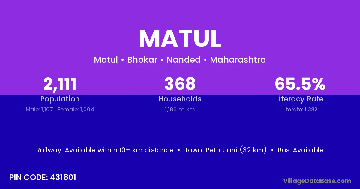 Peth Umri (32 km) is the nearest town to Matul village for major economic activities and is located approximately 32 km away.