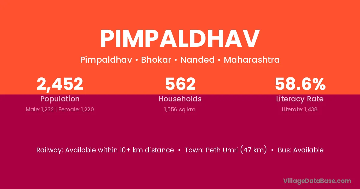 Peth Umri (47 km) is the nearest town to Pimpaldhav village for major economic activities and is located approximately 47 km away.