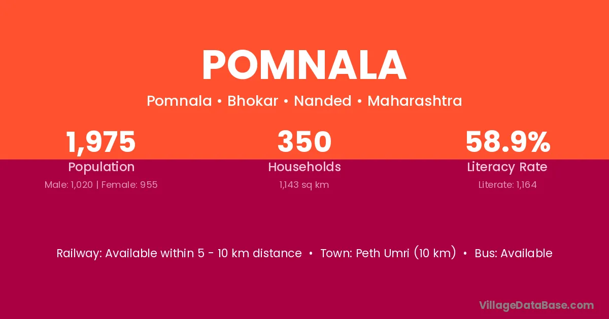 Peth Umri (10 km) is the nearest town to Pomnala village for major economic activities and is located approximately 10 km away.