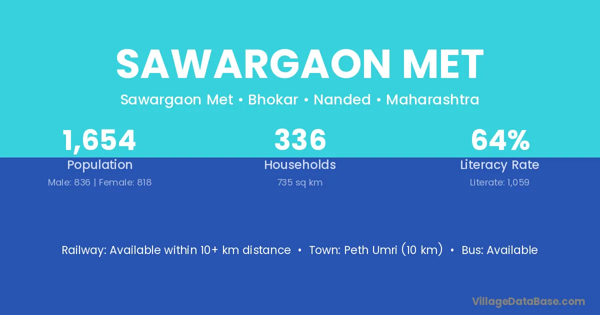 Peth Umri (10 km) is the nearest town to Sawargaon Met village for major economic activities and is located approximately 10 km away.