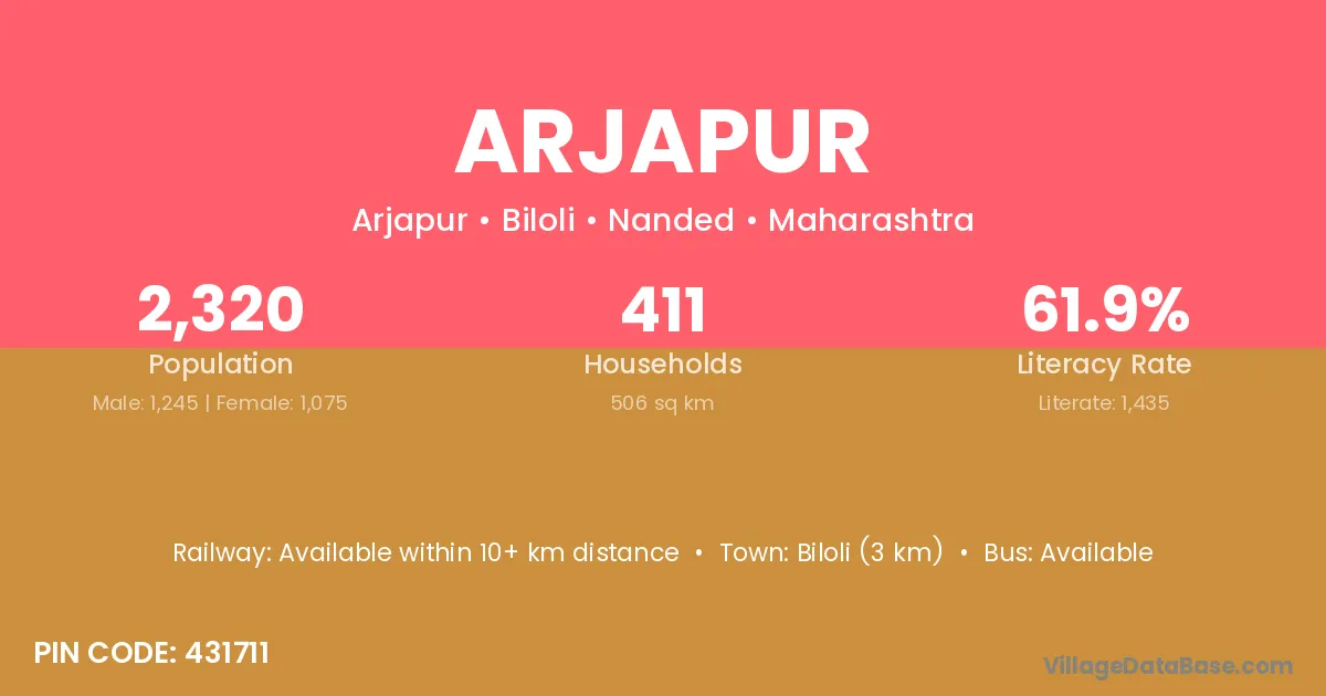Biloli (3 km) is the nearest town to Arjapur village for major economic activities and is located approximately 3 km away.