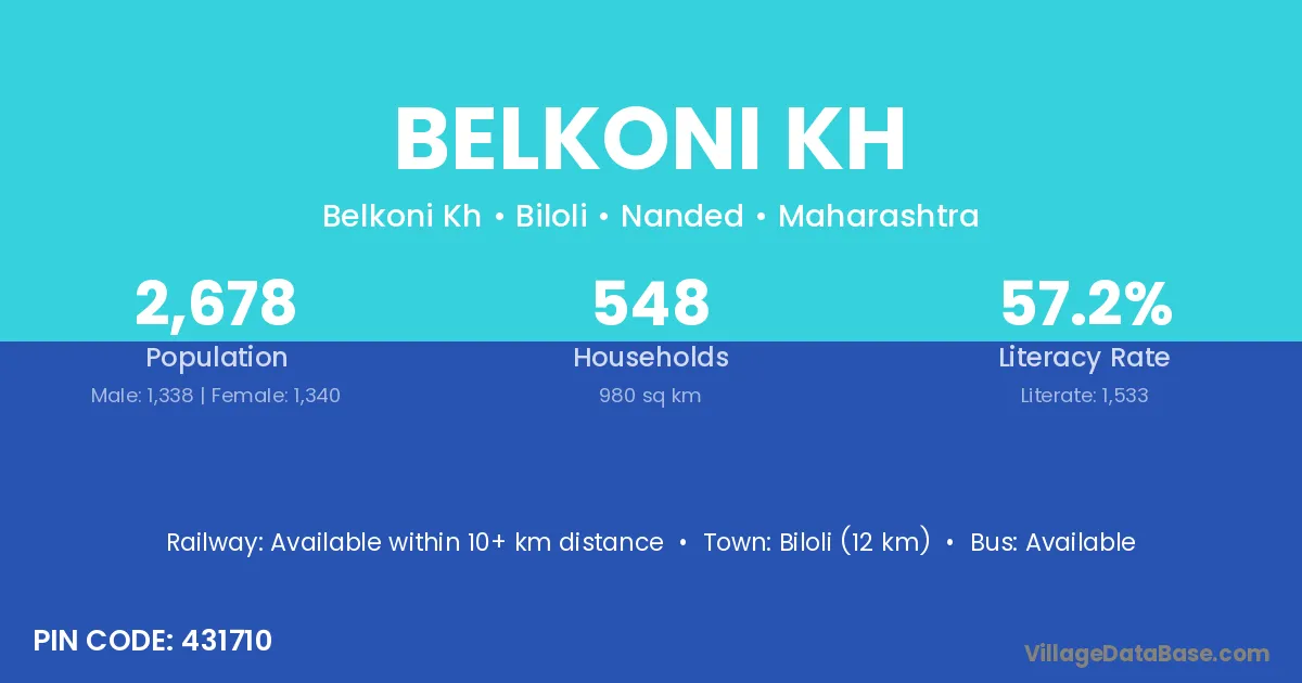 Biloli (12 km) is the nearest town to Belkoni Kh village for major economic activities and is located approximately 12 km away.