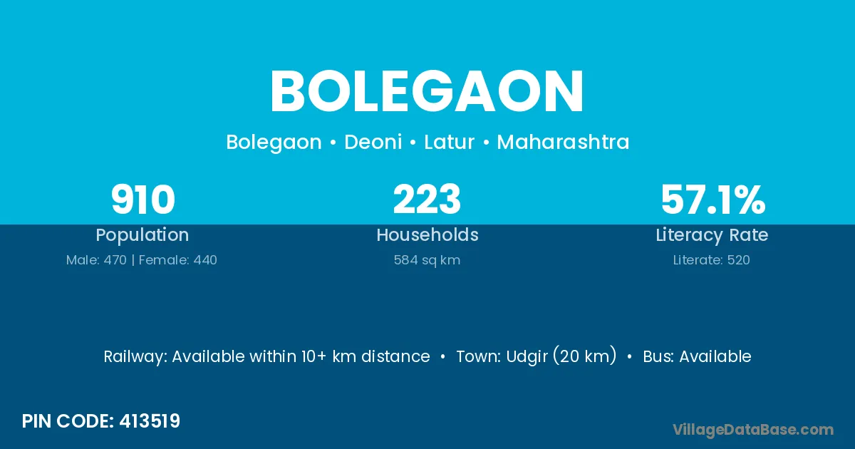 Biloli (10 km) is the nearest town to Bolegaon village for major economic activities and is located approximately 10 km away.
