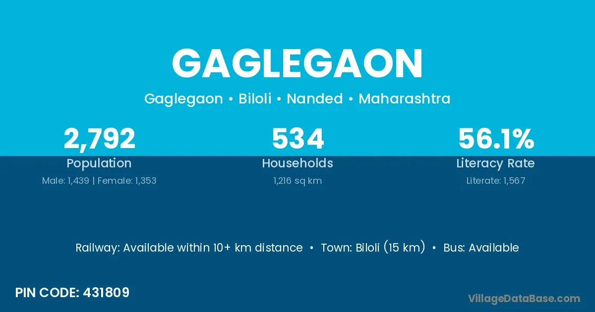 Biloli (15 km) is the nearest town to Gaglegaon village for major economic activities and is located approximately 15 km away.