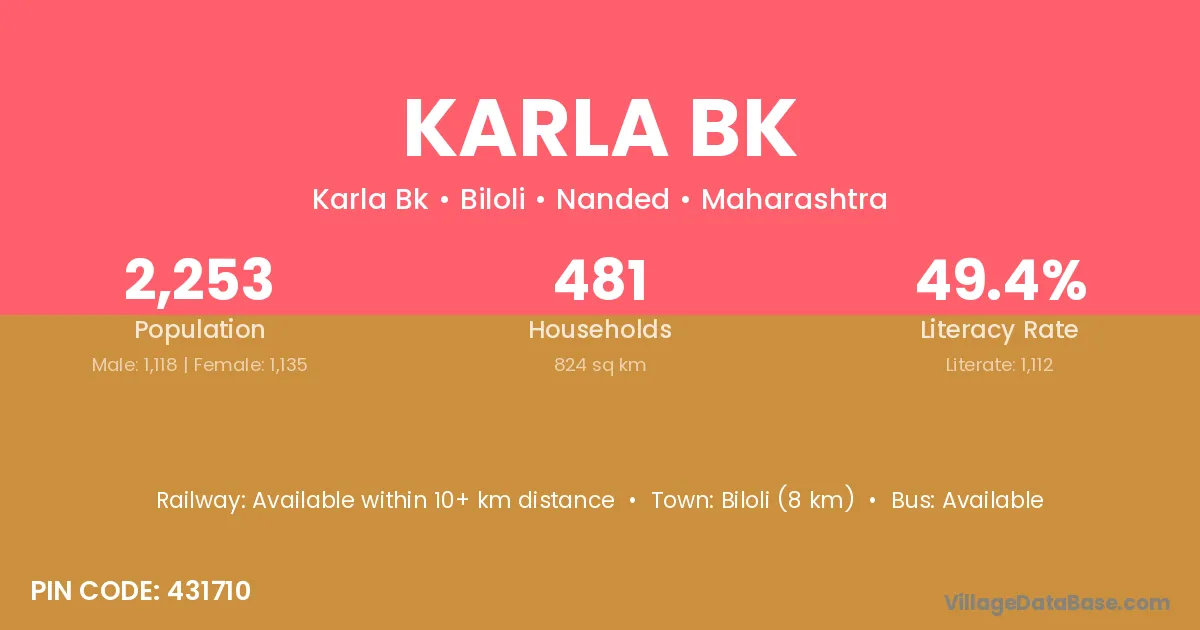 Biloli (8 km) is the nearest town to Karla Bk village for major economic activities and is located approximately 8 km away.