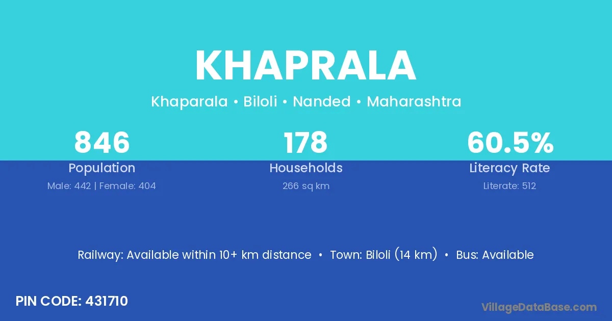 Biloli (14 km) is the nearest town to Khaprala village for major economic activities and is located approximately 14 km away.