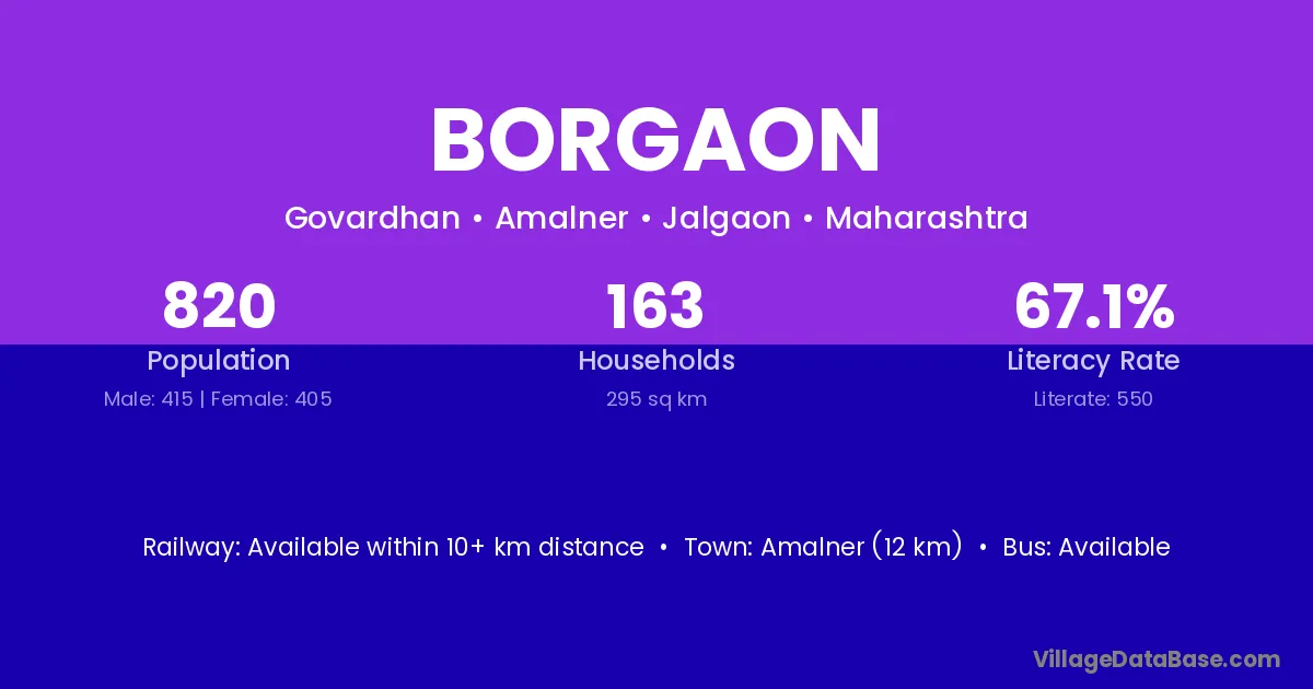 Deglur (8 km) is the nearest town to Borgaon village for major economic activities and is located approximately 8 km away.
