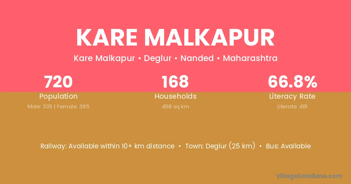 Deglur (25 km) is the nearest town to Kare Malkapur village for major economic activities and is located approximately 25 km away.
