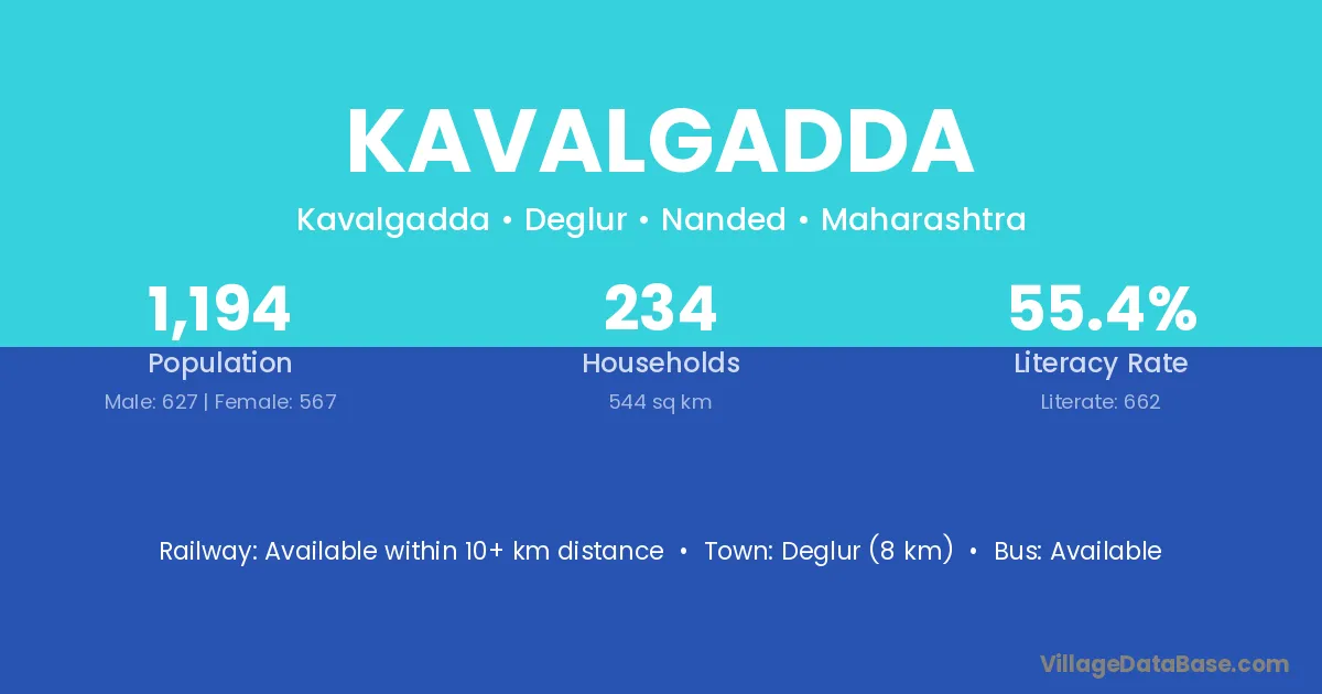 Deglur (8 km) is the nearest town to Kavalgadda village for major economic activities and is located approximately 8 km away.
