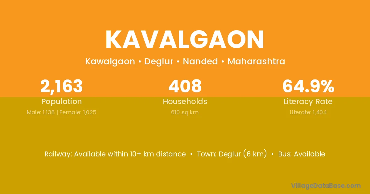 Deglur (6 km) is the nearest town to Kavalgaon village for major economic activities and is located approximately 6 km away.