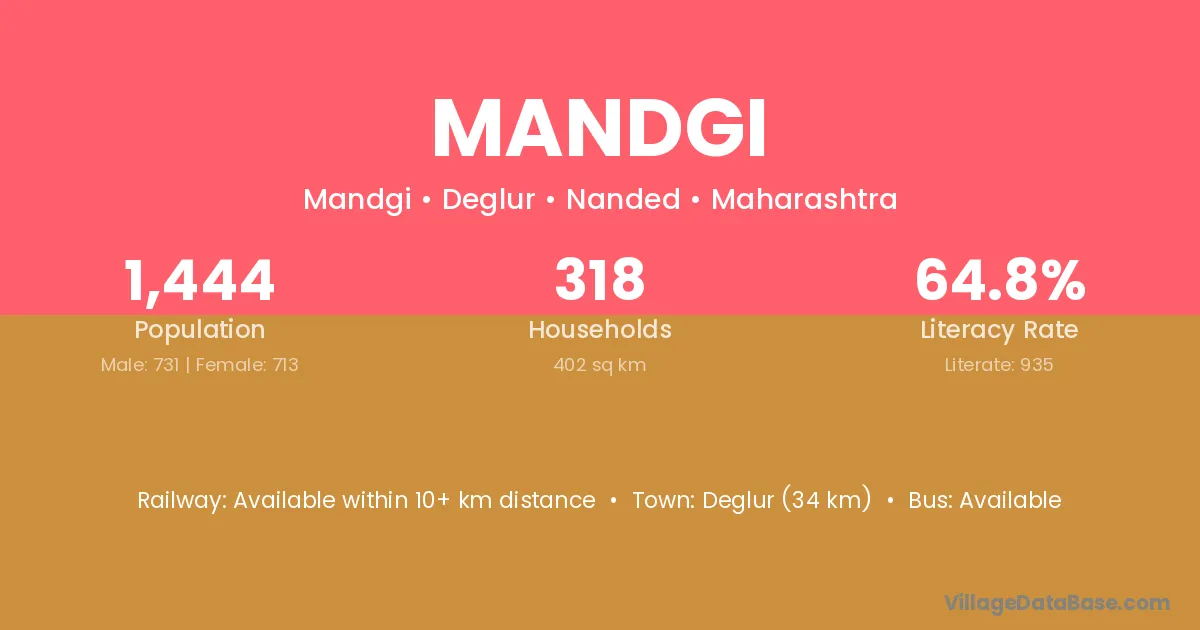 Deglur (34 km) is the nearest town to Mandgi village for major economic activities and is located approximately 34 km away.