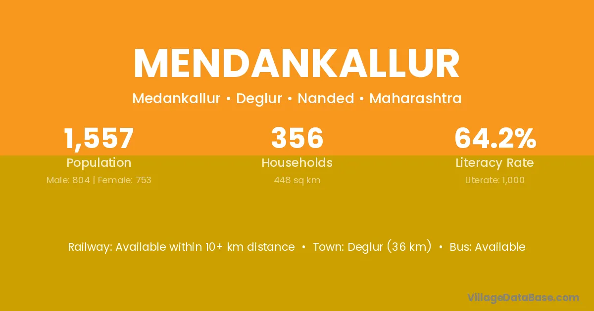 Deglur (36 km) is the nearest town to Mendankallur village for major economic activities and is located approximately 36 km away.