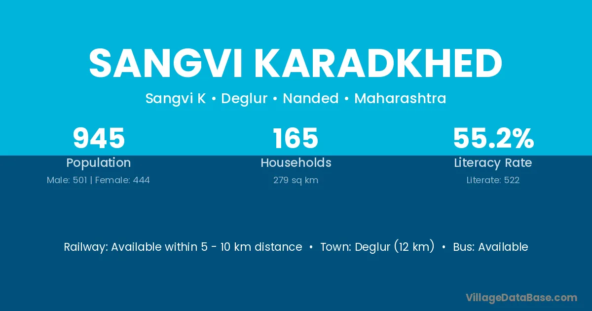 Deglur (12 km) is the nearest town to Sangvi Karadkhed village for major economic activities and is located approximately 12 km away.