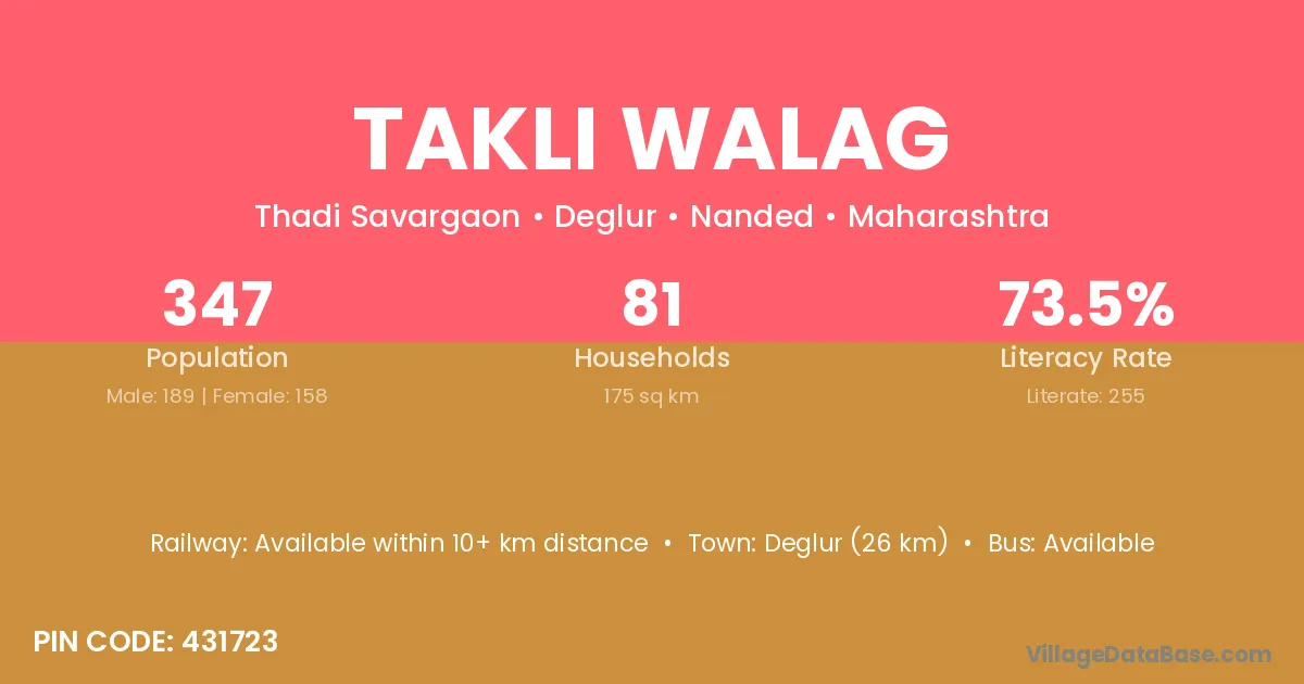 Deglur (26 km) is the nearest town to Takli Walag village for major economic activities and is located approximately 26 km away.