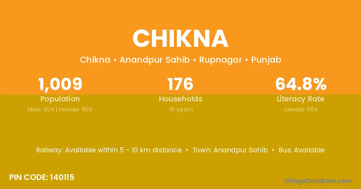 The literacy rate of Chikna village is 64.42%. Male literacy stands at 73.74% and female literacy at 55.06%.