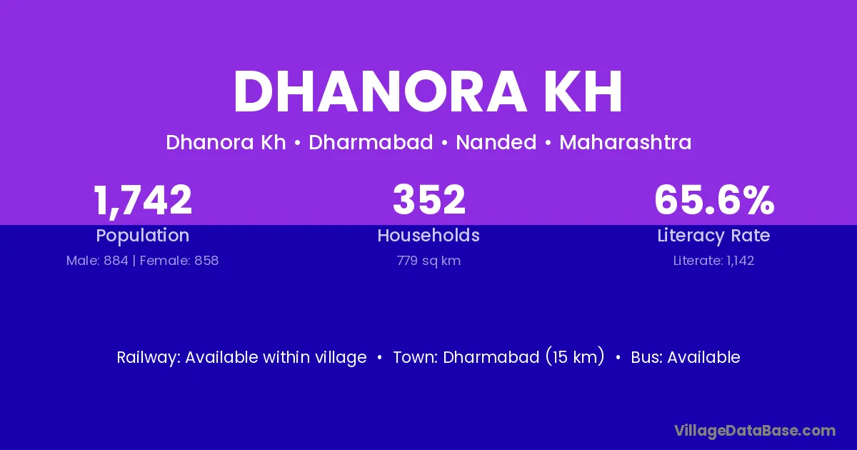 Dhanora Kh village has a total population of 1,742 people, of which 884 are males and 858 are females.