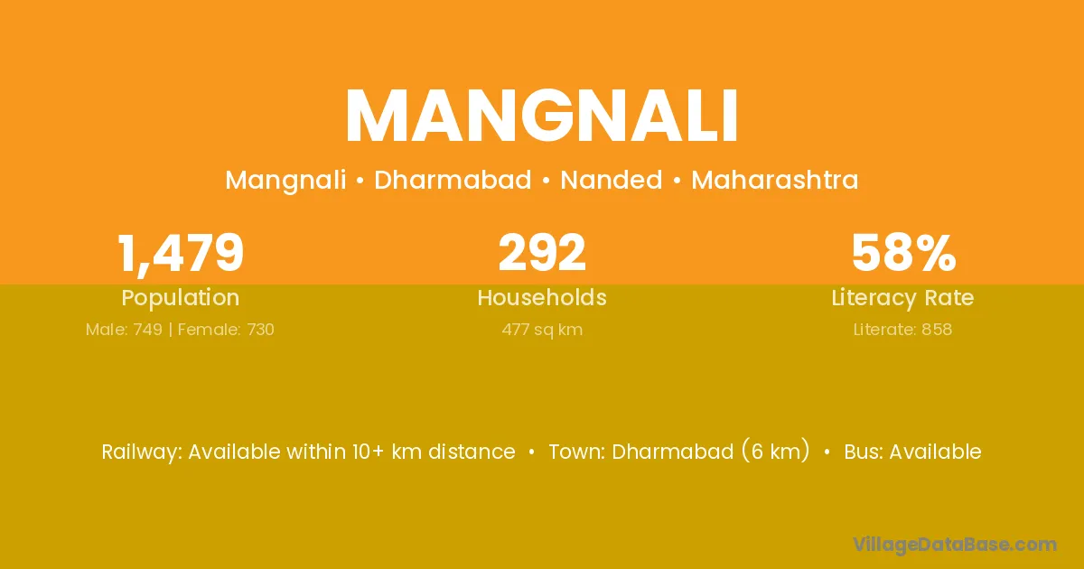 Dharmabad (6 km) is the nearest town to Mangnali village for major economic activities and is located approximately 6 km away.