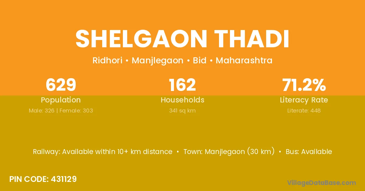 Kundalwadi (4 km) is the nearest town to Shelgaon Thadi village for major economic activities and is located approximately 4 km away.