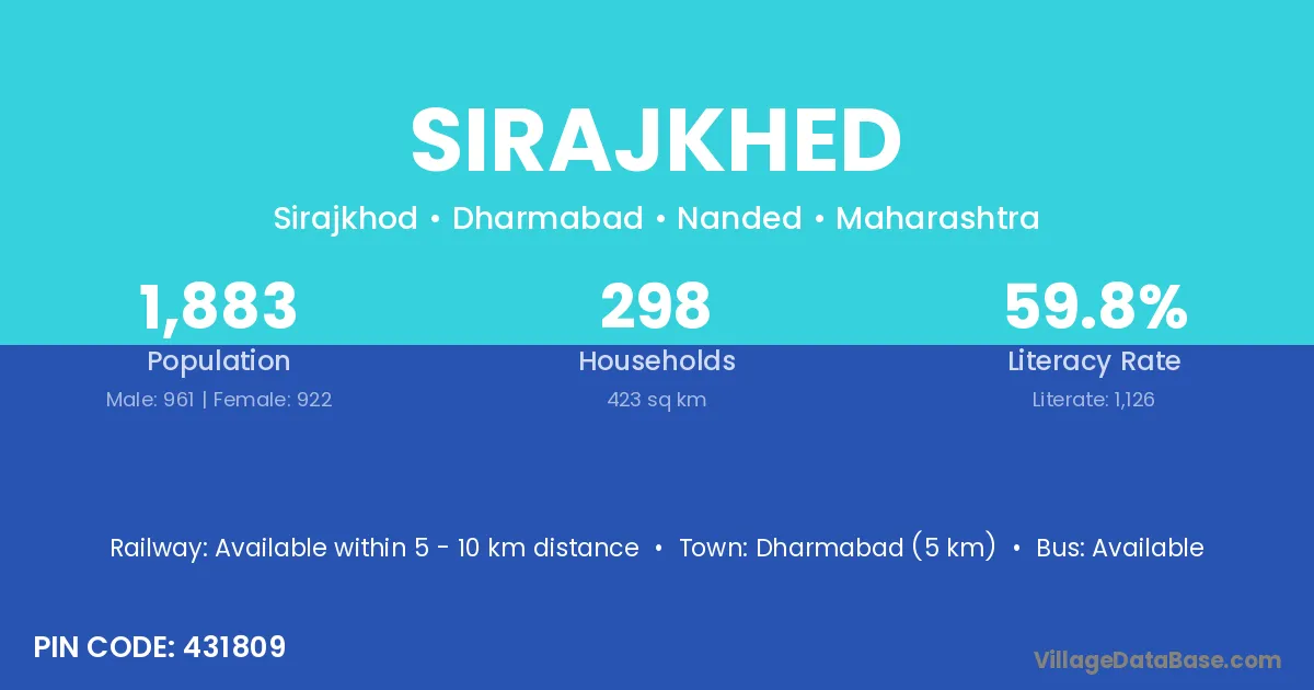 Dharmabad (5 km) is the nearest town to Sirajkhed village for major economic activities and is located approximately 5 km away.