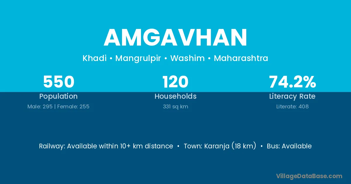 The literacy rate of Amgavhan village is 66.46%. Male literacy stands at 71.60% and female literacy at 61.02%.