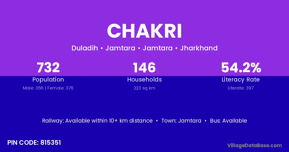 Chakri village has a total population of 1,231 people, of which 651 are males and 580 are females.