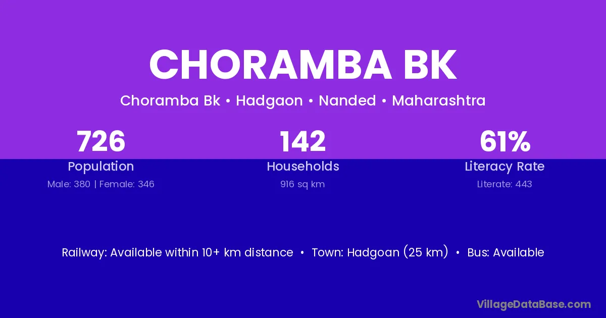 Hadgoan (25 km) is the nearest town to Choramba Bk village for major economic activities and is located approximately 25 km away.