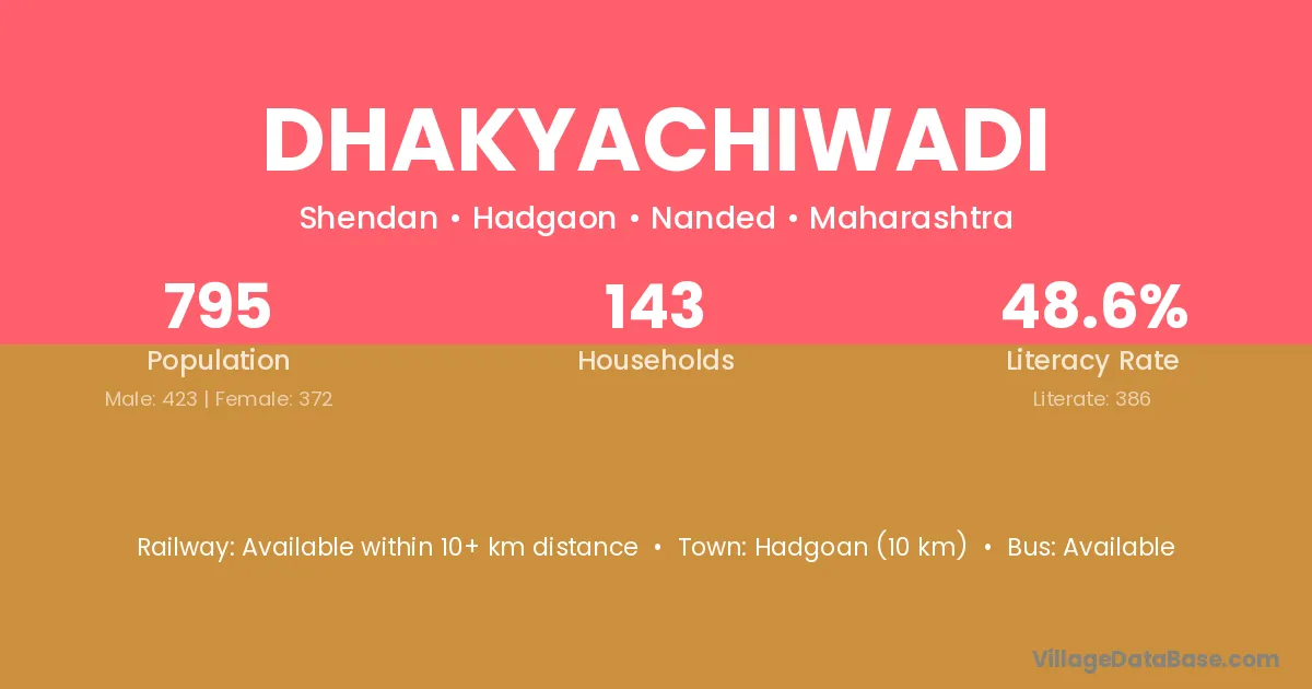 Dhakyachiwadi village has a total population of 795 people, of which 423 are males and 372 are females.