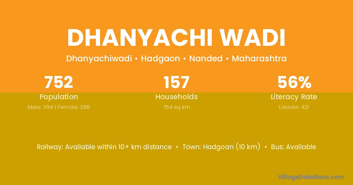 Dhanyachi Wadi village has a total population of 752 people, of which 394 are males and 358 are females.