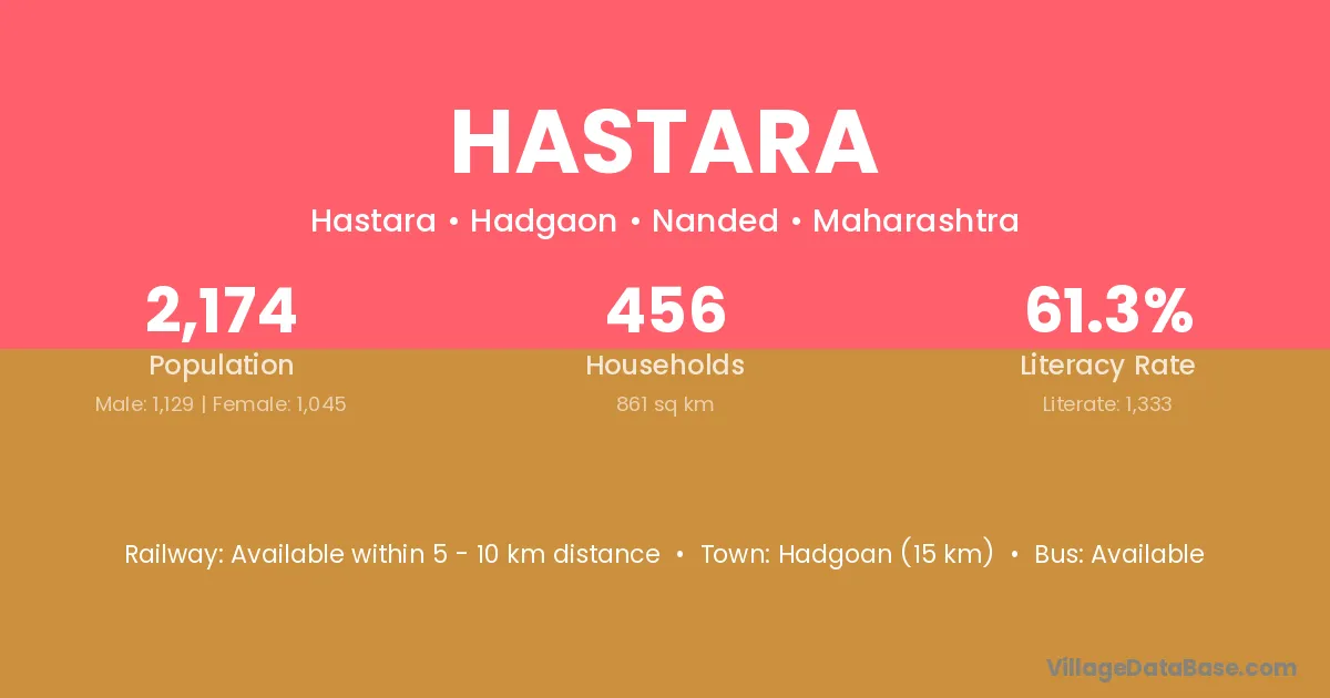 Hastara village has a total population of 2,174 people, of which 1,129 are males and 1,045 are females.