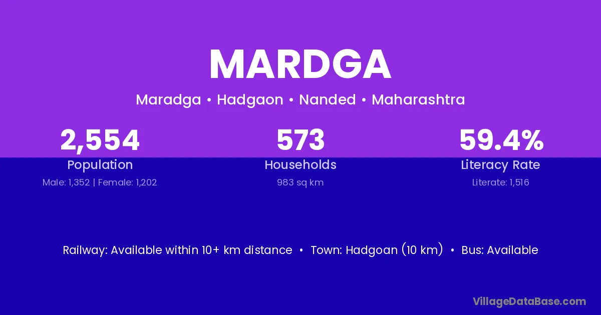 Hadgoan (10 km) is the nearest town to Mardga village for major economic activities and is located approximately 10 km away.