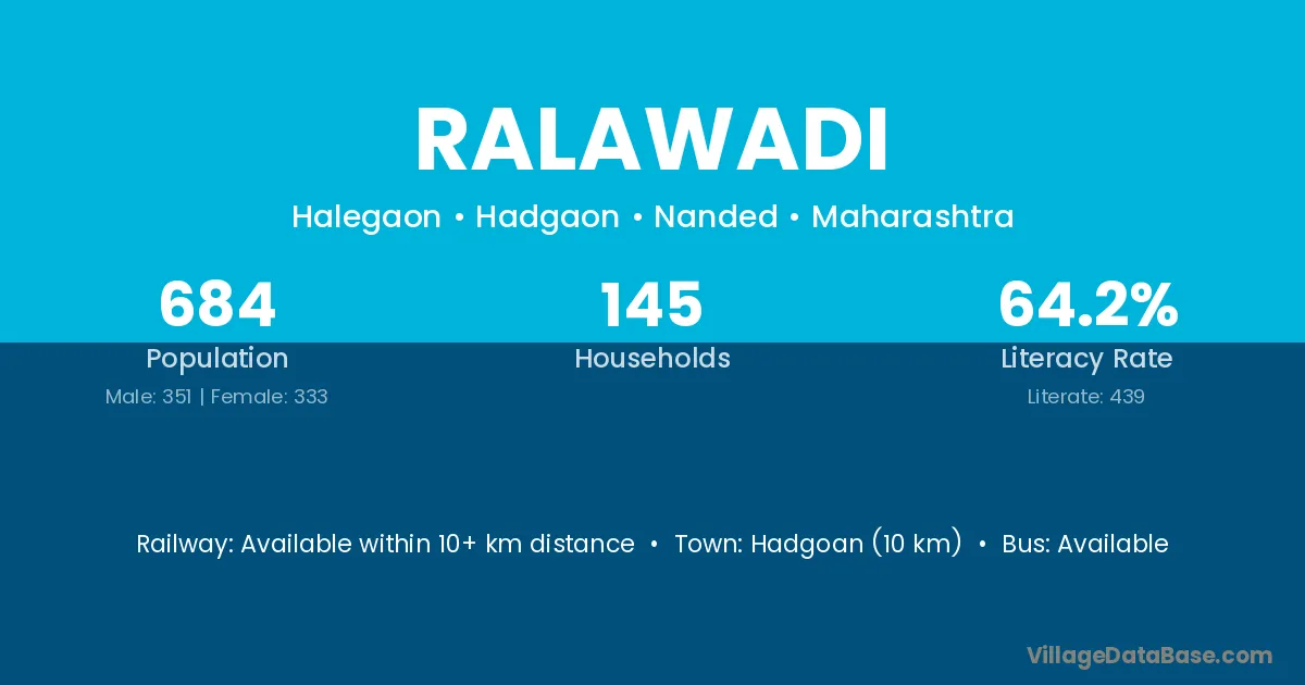 Ralawadi village has a total population of 684 people, of which 351 are males and 333 are females.