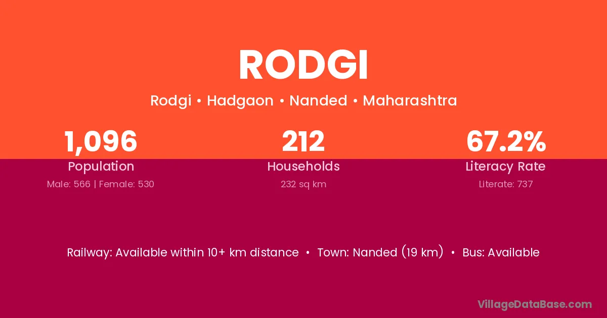 Nanded (19 km) is the nearest town to Rodgi village for major economic activities and is located approximately 19 km away.