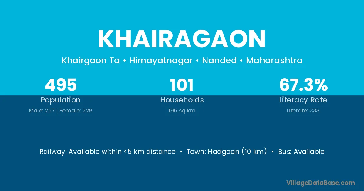 Hadgoan (10 km) is the nearest town to Khairagaon village for major economic activities and is located approximately 10 km away.