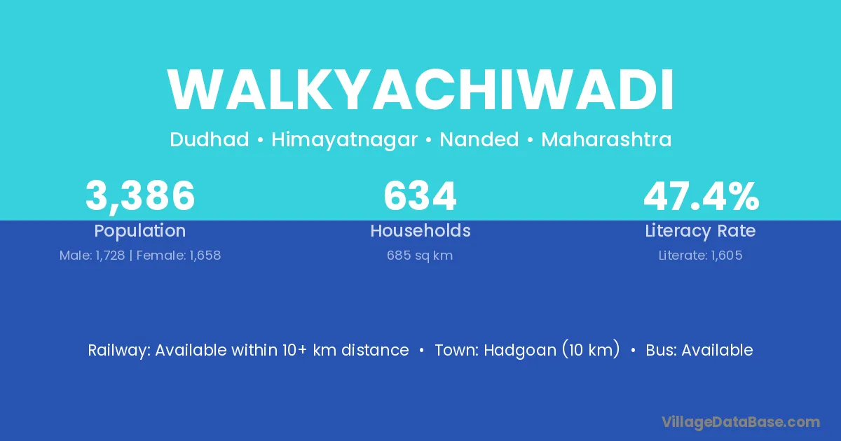 Walkyachiwadi village has a total population of 3,386 people, of which 1,728 are males and 1,658 are females.