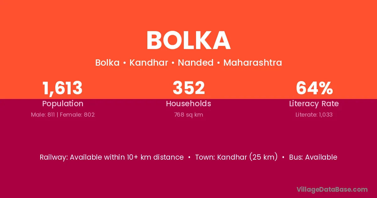 Kandhar (25 km) is the nearest town to Bolka village for major economic activities and is located approximately 25 km away.
