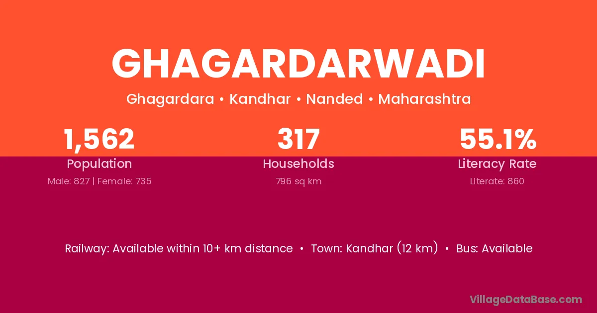 Kandhar (12 km) is the nearest town to Ghagardarwadi village for major economic activities and is located approximately 12 km away.