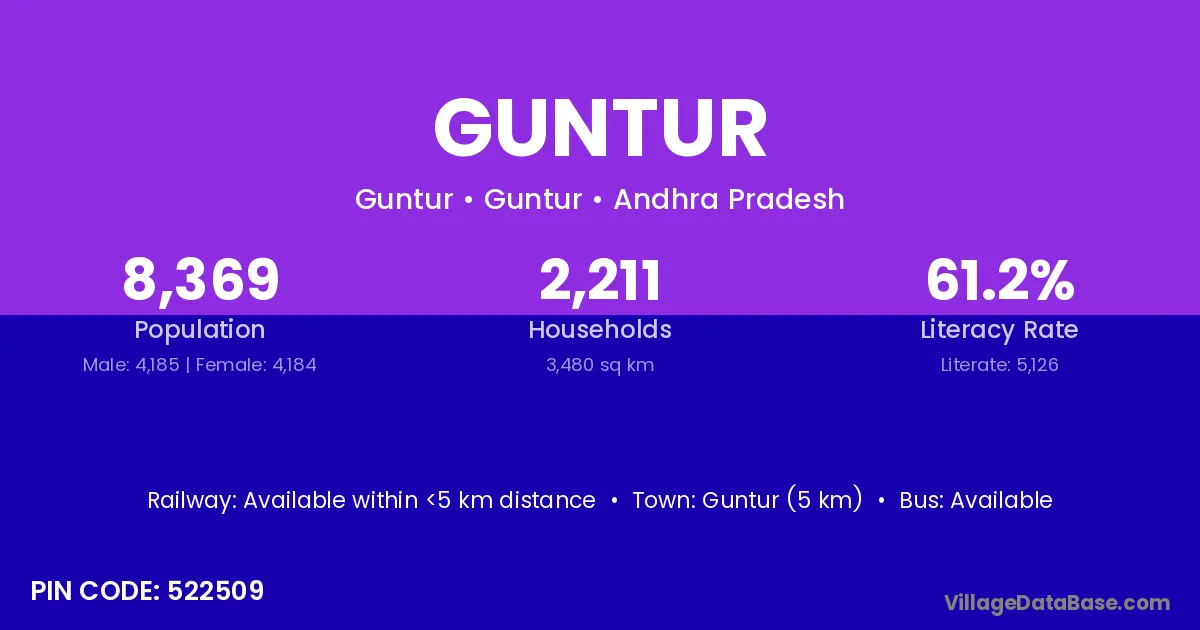 The literacy rate of Guntur village is 58.15%. Male literacy stands at 67.09% and female literacy at 48.52%.