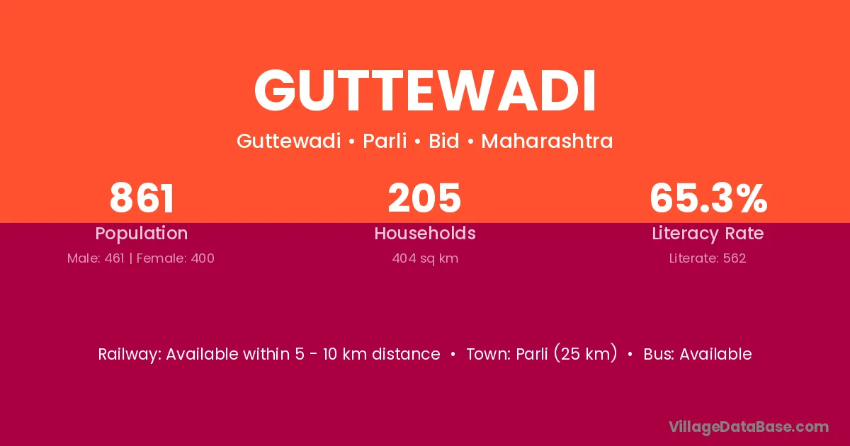 Kandhar (72 km) is the nearest town to Guttewadi village for major economic activities and is located approximately 72 km away.