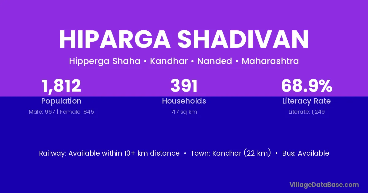 Kandhar (22 km) is the nearest town to Hiparga Shadivan village for major economic activities and is located approximately 22 km away.