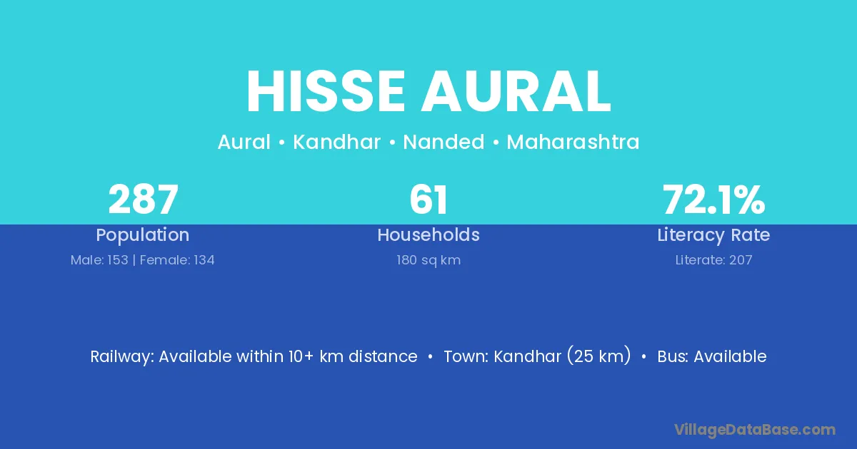 Kandhar (25 km) is the nearest town to Hisse Aural village for major economic activities and is located approximately 25 km away.