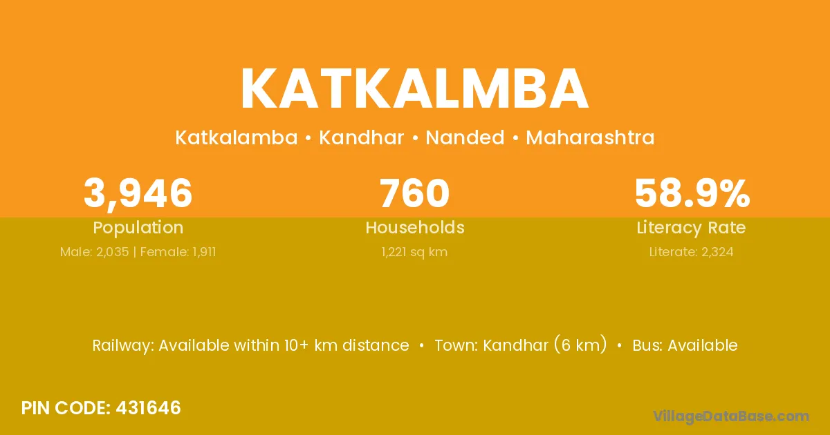 Kandhar (6 km) is the nearest town to Katkalmba village for major economic activities and is located approximately 6 km away.