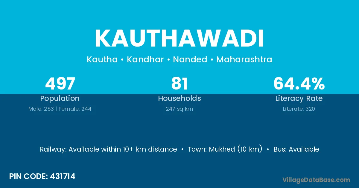 Kauthawadi village has a total population of 497 people, of which 253 are males and 244 are females.