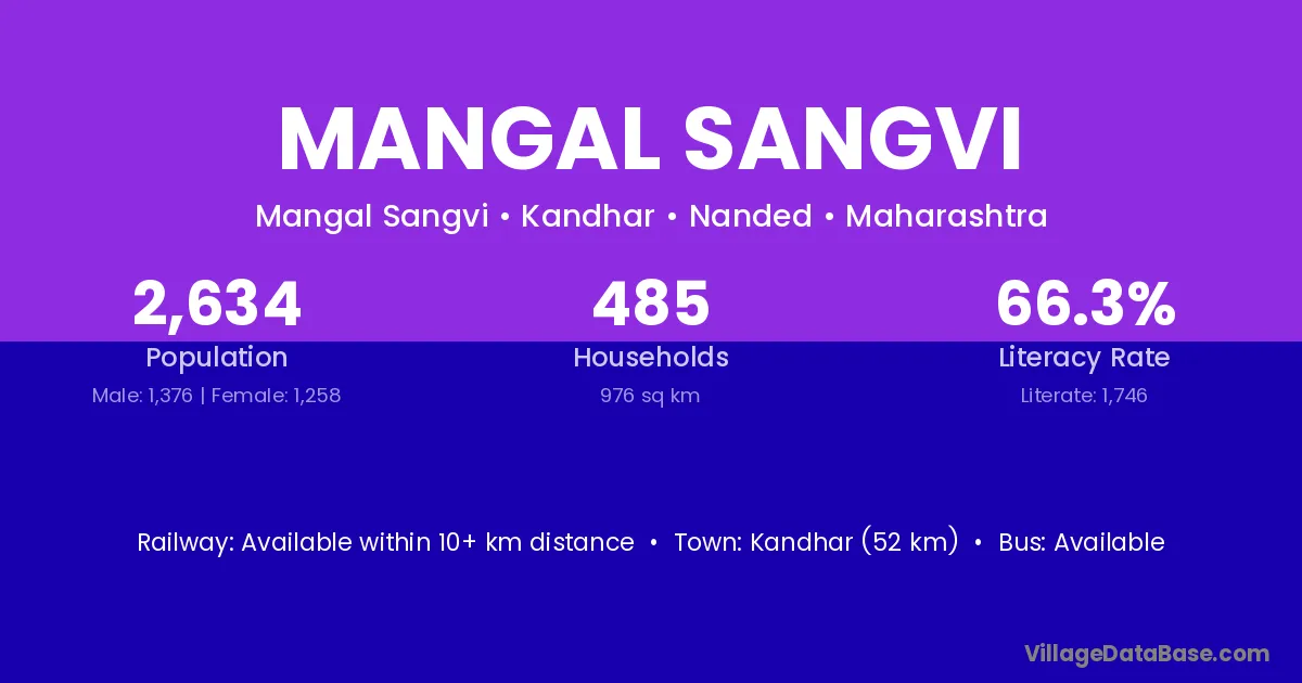 Kandhar (52 km) is the nearest town to Mangal Sangvi village for major economic activities and is located approximately 52 km away.