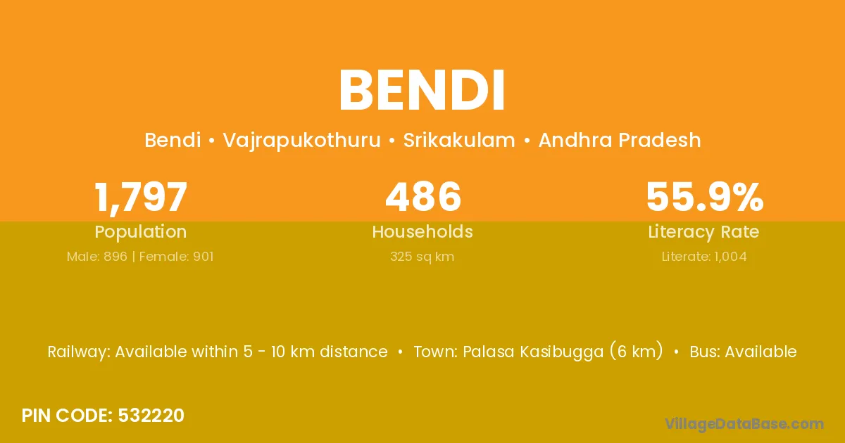The literacy rate of Bendi village is 67.65%. Male literacy stands at 69.64% and female literacy at 65.87%.