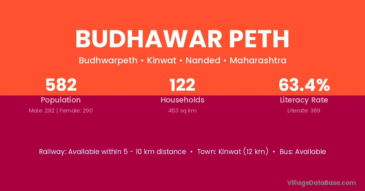 Kinwat (12 km) is the nearest town to Budhawar Peth village for major economic activities and is located approximately 12 km away.