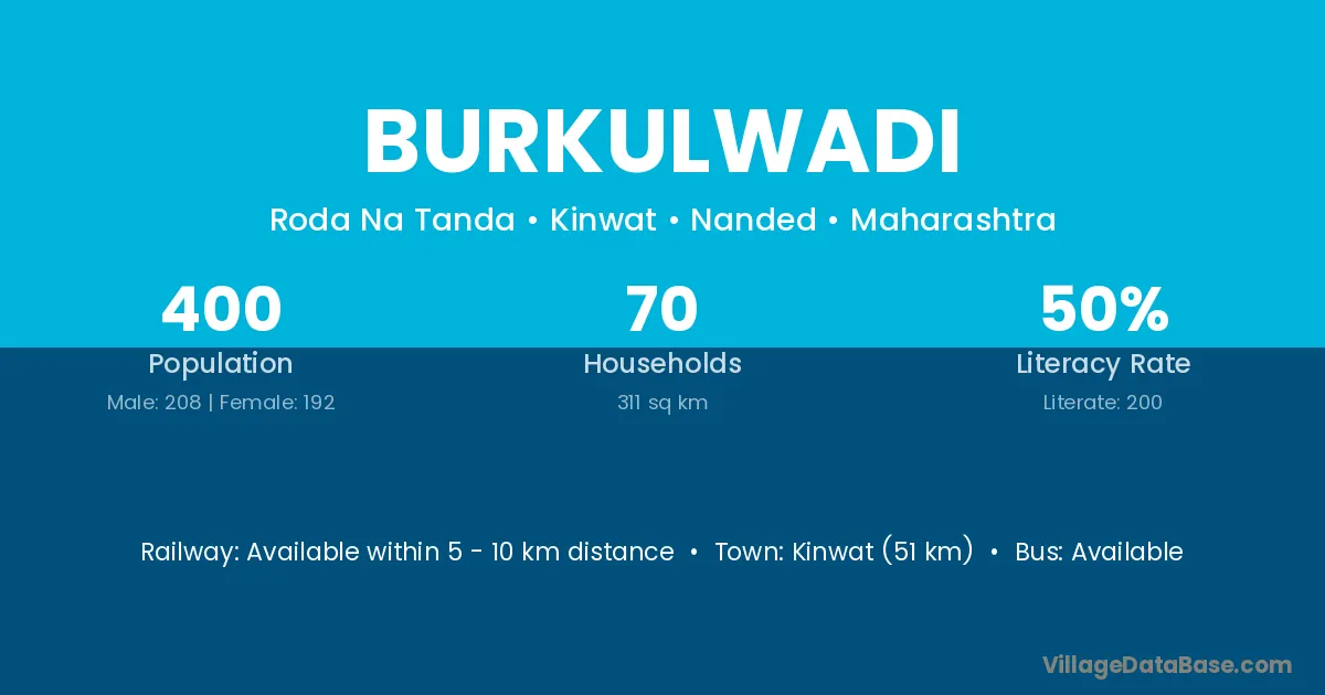 Kinwat (51 km) is the nearest town to Burkulwadi village for major economic activities and is located approximately 51 km away.