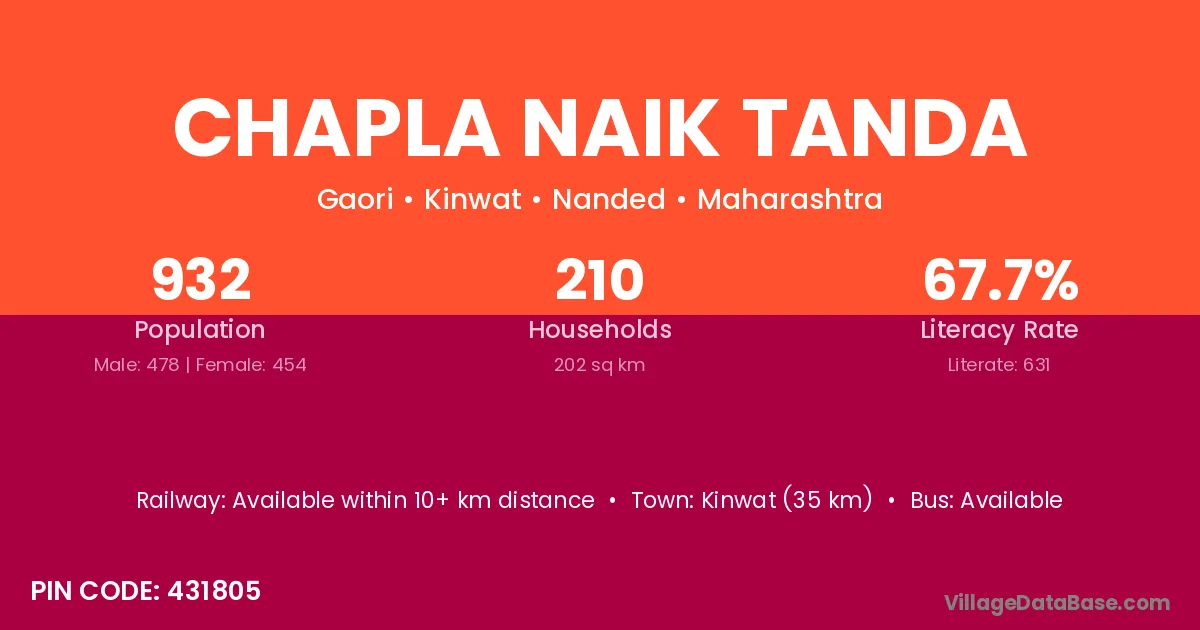 Chapla Naik Tanda village has a total population of 932 people, of which 478 are males and 454 are females.