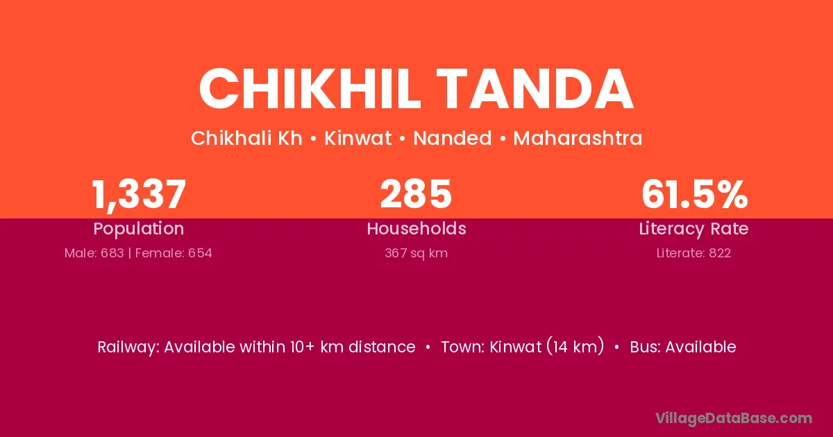 Kinwat (14 km) is the nearest town to Chikhil Tanda village for major economic activities and is located approximately 14 km away.
