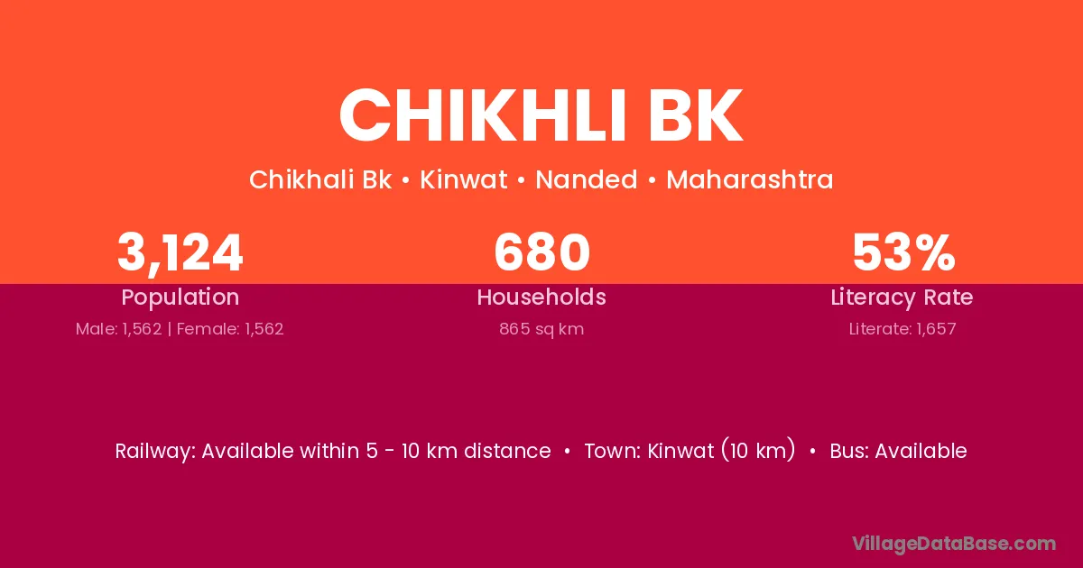 Chikhli Bk village has a total population of 3,124 people, of which 1,562 are males and 1,562 are females.